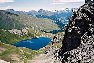 Lac Mezan - © Patrice Roatta En accédant aux lacs supérieurs, vous aurez une belle vue sur la haute vallée du Guil et le village d'Abries. Derrière, le Mont-Viso (3841 m) domine avec sa tête enneigée.