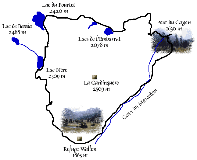 Le lac du Pourtet se trouve sur le circuit qui fait le tour de la cardinquère. Pour cela, il vous faudra d'abord parvenir au pont de Cayan en emprunant la vallée du marcadau. C'est une balade que peuvent réaliser les enfants ; poursuivre jusqu'au lac du Pourtet demandera un peu plus d'effort mais c'est dans le domaine du réalisable. Le plus dur se fait en forêt, à l'abri des rayons du soleil. La balade se découpe en deux partie. La première partie, la plus facile, vous conduire, le long du gave du Marcadau, jusqu'au pont de Cayan. ![]() Au pont de Cayan, vous bifurquerez sur la droite pour prendre la direction des lacs de l'Embarrat. Continuez ensuite le sentier qui fait le tour de la Cardinquère (2509 m) pour voir les lacs du Pourtet et le lac Nère. Vous terminerez le tour des lacs par le lac de Bassia. Pour rentrer vous pouvez soit faire marche arrière, soit terminer la boucle pour parvenir au refuge wallon et ensuite longer le gave du Marcadau. ![]() |