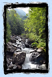 Nous voici arrivés au parking supérieur dont l'accès se fait par un sentier assez poussiéreux. Comme nous avons un peu lambiné sur le sentier, le reste de la troupe nous attend sagement assis sur la rambarde du pont qui enjambe le torrent. Nous continuons tout droit, en laissant sur la gauche le sentier qui conduit vers la cascade de la Buffe. Un peu plus loin, ce sont les ruines de Navette qui se cache dans la forêt. Seule la chapelle a été restaurée. Les autres bâtiments se cachent derrière les arbres, tels les temples d'Angkor. Après Navette, c'est une sombre forêt qui se présente devant nous. Le sentier devient chemin et s'engouffre dans la pénombre de la forêt dont la densité masque les rayons de soleil. Aussi, le sol n'est que terre parsemée d'aiguilles des conifères. Quelques champignons tachètent cette surface marron de leur blancheur. 500 mètres plus loin, nous sortons du bois ; un peu plus loin, c'est la cascade de Buchardet qui nous attend. Le détour n'est pas long pour se rendre en son pied. Nous sommes à 1370 mètres. Partis de 1200 mètres, le dénivelé est insignifiant sur ces 3 kilomètres.