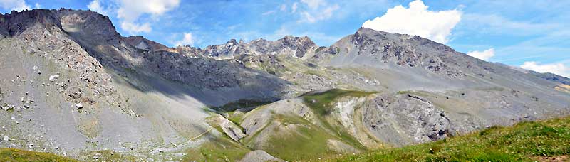 Le départ se fait depuis le col de Larche, à la frontière franco-italienne, altitude 1991m. Le sentier part vers le nord au travers de la prairie. Nous rejoindrons au bout d'un kilomètre le ruisseau de l'Orrenaye qui arrive du lac. Nous le traverserons un peu plus loin. Puis nous abandonnons le chemin principal pour prendre une variante qui permet de gagner quelques mètres. Le lac est rapidement là. Nous avons parcouru 4 kilomètres depuis le col, tranquillement en 1h30. Nous prendrons le chemin qui monte sur la rive droite du lac pour rejoindre le col du Roburent et la frontière matérialisée par des balises d'époques. Le premier lac du Roburent apparaît, sombre sous le ciel chargé. La tranquillité est bien présente en ce lundi estival. Loin des circuits habituels, il permet de se relaxer, le tout est de se mettre à l'abri du vent. C'est là que nous prendrons notre repas avant de continuer en territoire italien. Plus loin, les deux autres lacs du Roburent annoncent la fin du plateau et le début de la descente, au travers de prairie. Quasiment aucun arbre dans le coin. ![]()