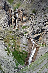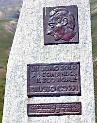 Après un dénivelé assez important, nous longeons un vallon en faux plat qui nous conduira au lieu dit la Tinetta. Un torrent se jette dans le ruisseau en bas du vallon, seul signe de vie dans ce désert. Une marmotte brisera cette solitude, allongée sur sa pierre. De nouveau, un gros dénivelé se présente pour rejoindre la route du col de Larche et le village d'Argentera. Sensation bizarre lors de la traversée du village, dont la moitié des habitations est à vendre, ce que l'on peut comprendre vu l'intensité du trafic, et la présence de nombreux poids lourds. Comme hier, il faut maintenant retrouver le col de Larche sur le bitume. C'est pas le plus amusant mais il faut bien revenir avec de nouveau 250 mètres de dénivelé et 4 kilomètres avant de retrouver le très champêtre lac de la madeleine. Très joli lac, situé en bordure de la route, peuplé de chevaux en liberté et d'une herbe bien grasse et bien verte. A noter sur le bord de la route, la source Napoléon. ![]() Encore quelques mètres avant de revenir en France, en faisant un détour par la stèle à l'honneur de Fausto Coppi.