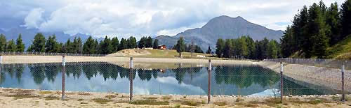Nous arrivons sous le téléski de Serreglier. Juste après la bosse le réservoir d’eau de la station apparait, fermé au public. Puis nous le quittons par la gauche pour nous rendre au sommet où trône la croix St Philippe. Il y a fort longtemps, vers le XI° siècle, une tour dominait ici, et ainsi que le village de Faudon en contrebas. Il n’est reste quasiment plus rien, si ce n’est des pierres. Les lieux qui hébergèrent le village à fait l’objet de fouille et la carte IGN le signale comme un site archéologique. De notre position, nous avons une vue vers le lac de Serre Ponçon, sur Gap et sur le Champsaur. Hélas, comme pressenti, les nuages sont là pour nous barrer l’horizon, offrant un contraste entre la noirceur de la montagne et l’éclat des champs cultivés baignant sous le soleil. ![]()