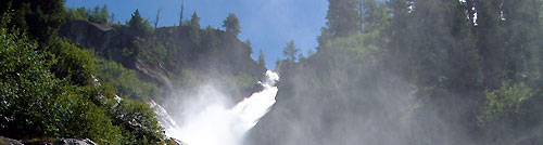 Cette montée brève mais sportive est de temps en temps entrecoupée de zone de plat vous permettant d'apercevoir à travers les arbres, les furieuses cascades. Avant de parvenir à la seconde cascade, en regardant en arrière vous pouvez apprécier le panorama sur la vallée et sur le Mont Blanc, qui, cette fois, est caché sous un nuage. Cette seconde cascade ne bénéficie pas hélas du même point de vue que la première. C'est fort dommage car elle est magnifique.